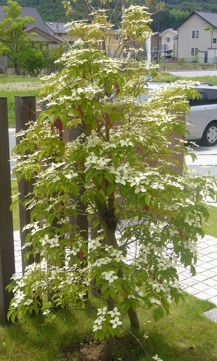 常緑樹植栽ヤマボウシ【山法師】 常緑のホンコンヤマボウシは樹形が細くまとまり、狭い場所にも植えられます。初夏にはクチナシが白い花と甘い香りを届けます。常緑なので冬も寂しくならず、葉色や形の組み合わせにより、爽やかにまとまります。
