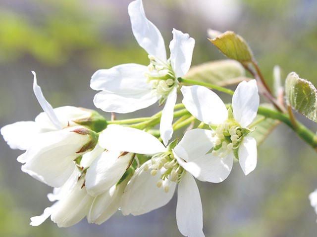 落葉樹植栽ジューンベリー 細長い五弁の白い花が鈴なりに咲く姿が可憐で美しく、6 月になるとブルーベリーに似た形の赤い実がつきます。黒く色づき完熟した実はジャムや果実酒に利用できます。バラ科。 ジューンベリーは西日を嫌うので、植栽場所に注意されると良いでしょう。